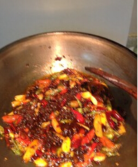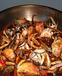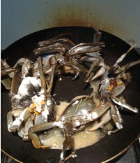 6、放入调味料,香锅底料翻炒(火锅底料也可以),根据螃蟹的分量,如果量少的话,底料量也应相应减少,否在味道太重了放入之前煎好的螃蟹,加点水,加盖。 沸煮后,变小火,收汁